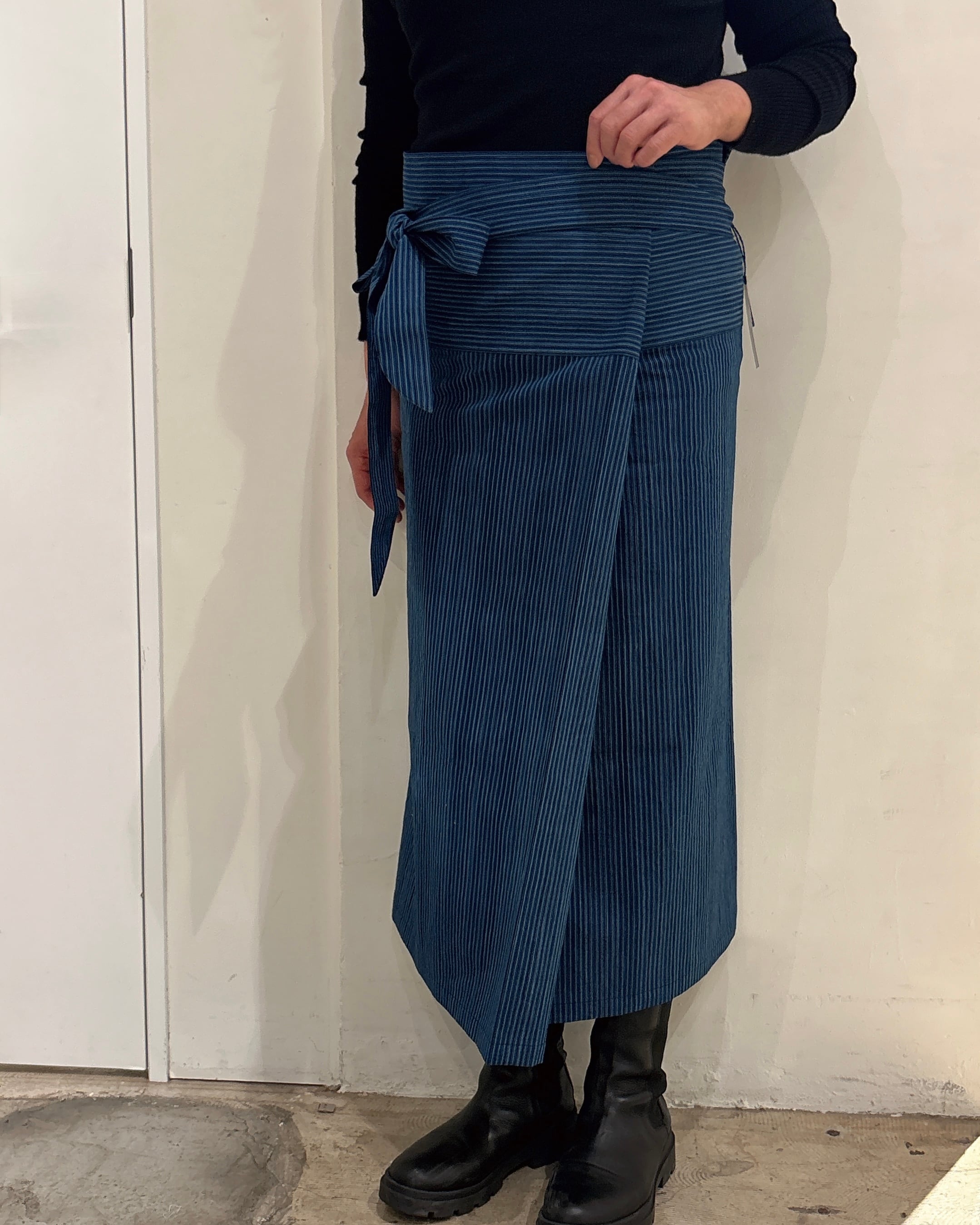 松阪木綿の伝統的な織り柄を使用した【松阪木綿 正藍縞】サロンスカート 。独特の風合いと上品な藍色が魅力です。織りの技術を知り尽くした職人が手作業で丹念に仕上げました。シンプルながらも洗練されたデザインで、どんなトップスとも相性抜群。日本の伝統的な技術と美しさを感じながら、日常をもっと特別なものに変えてみませんか。