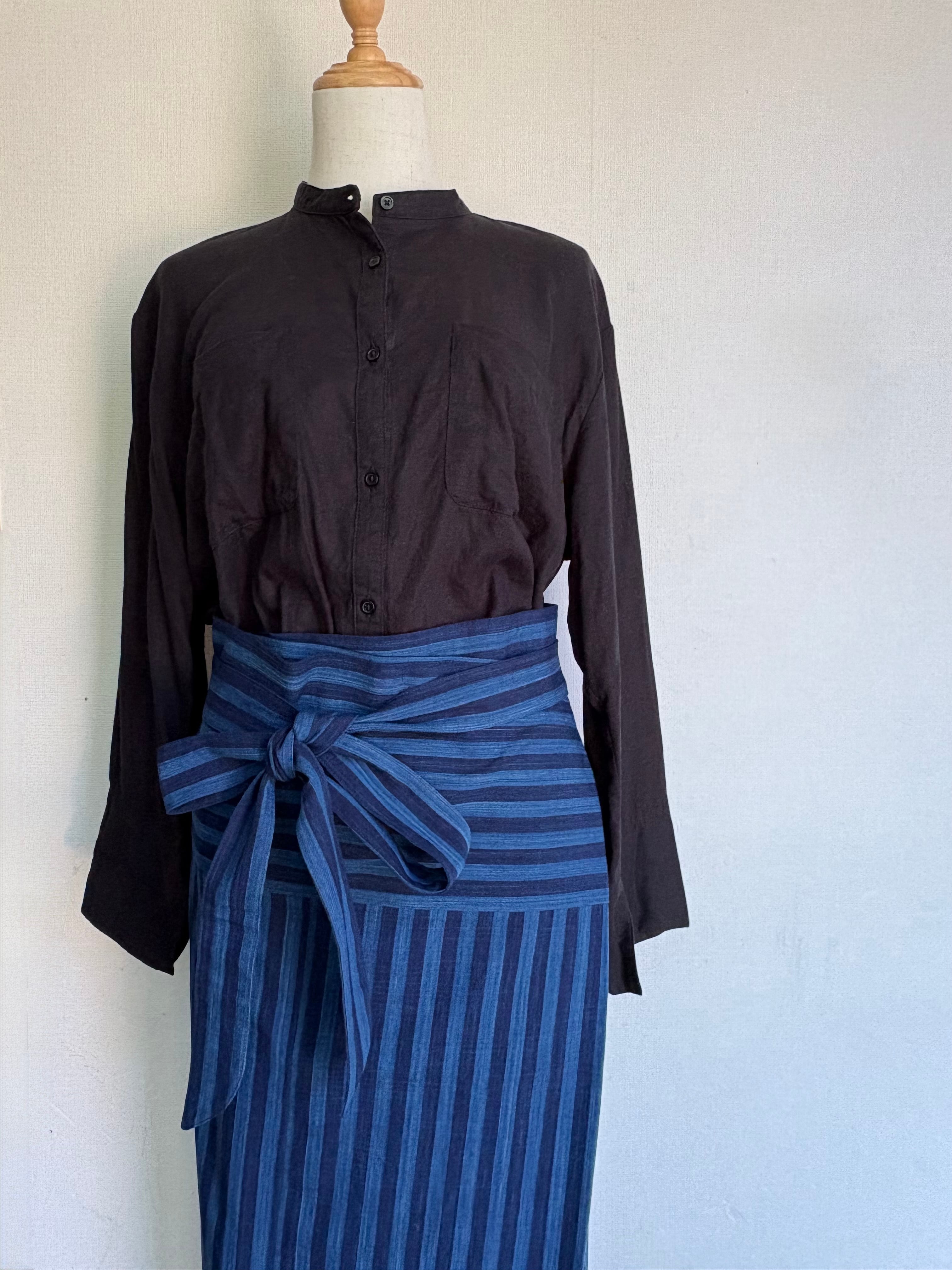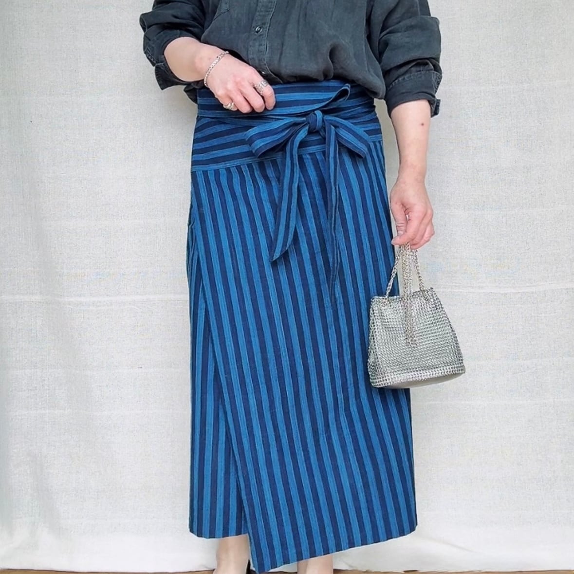 松阪木綿の伝統的な織り柄を使用した【松阪木綿 正藍縞】サロンスカート 。独特の風合いと上品な藍色が魅力です。織りの技術を知り尽くした職人が手作業で丹念に仕上げました。シンプルながらも洗練されたデザインで、どんなトップスとも相性抜群。日本の伝統的な技術と美しさを感じながら、日常をもっと特別なものに変えてみませんか。