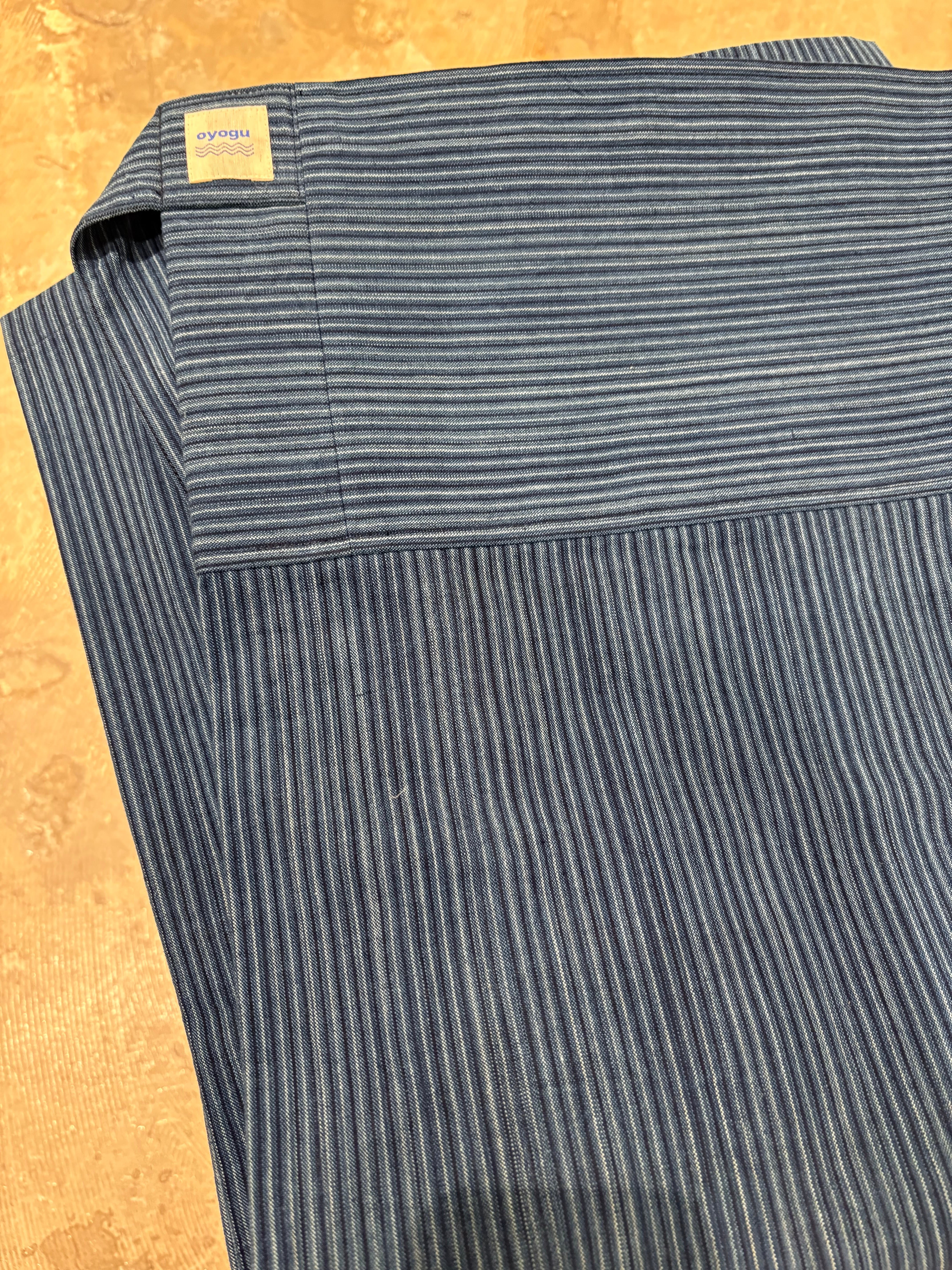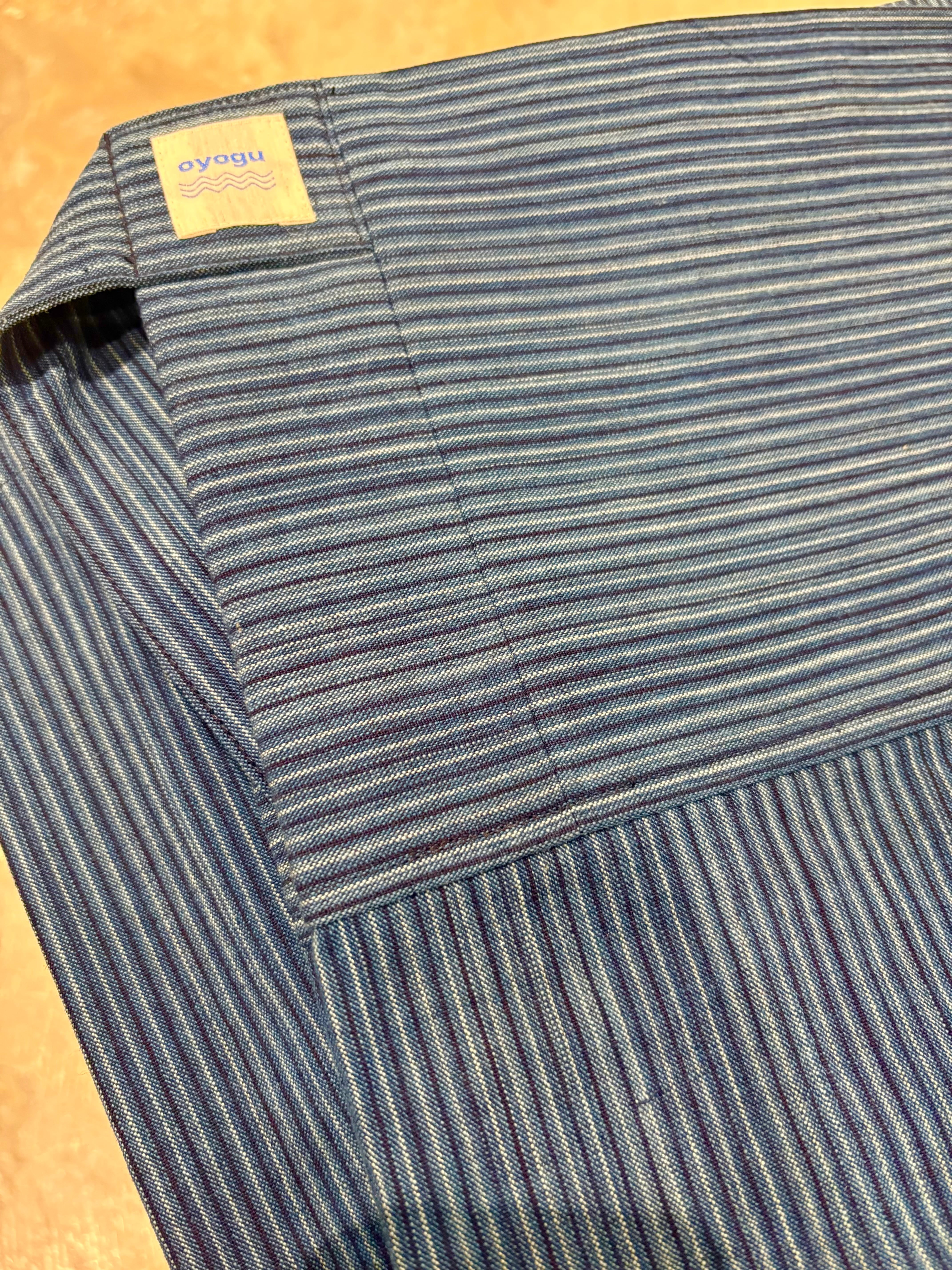 松阪木綿の伝統的な織り柄を使用した【松阪木綿 正藍縞】サロンスカート 。独特の風合いと上品な藍色が魅力です。織りの技術を知り尽くした職人が手作業で丹念に仕上げました。シンプルながらも洗練されたデザインで、どんなトップスとも相性抜群。日本の伝統的な技術と美しさを感じながら、日常をもっと特別なものに変えてみませんか。